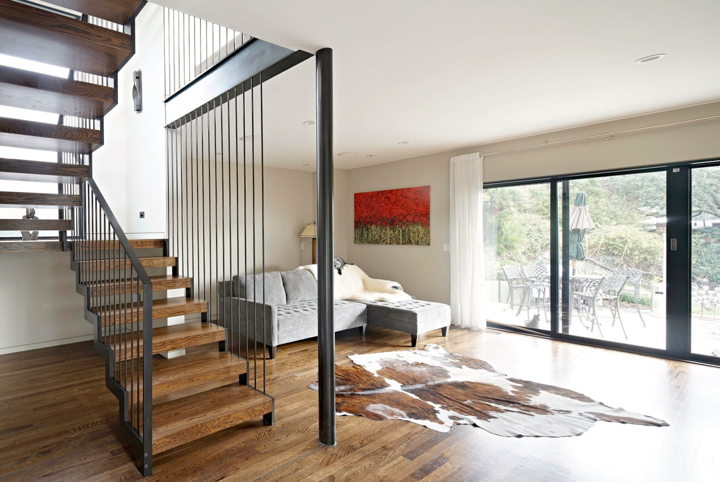Inserting an open-tread stairway makes all the difference in this once-dark home, but getting there involved removing some walls and adding some windows. The resulting metal and wood stair system seems to float through the center of the house, introducing light and air to each of its three floors. It forms a great visual centerpiece to the other rooms which were all renovated and refreshed. The kitchen is also completely remodeled and, in a nod to our obsession with details, some of the stairway steelwork is echoed in the details on the island.